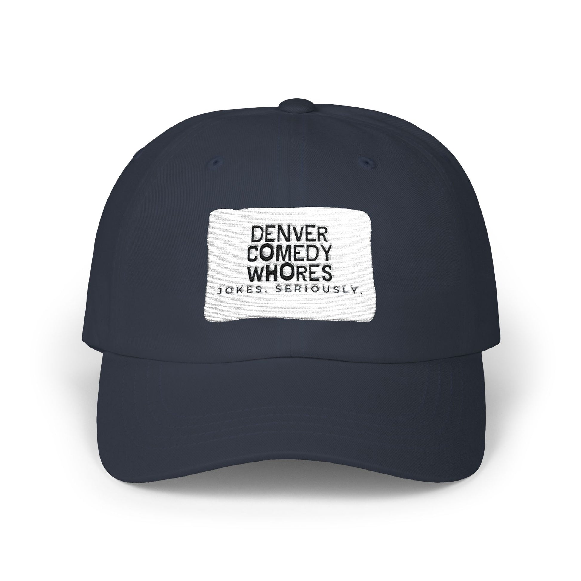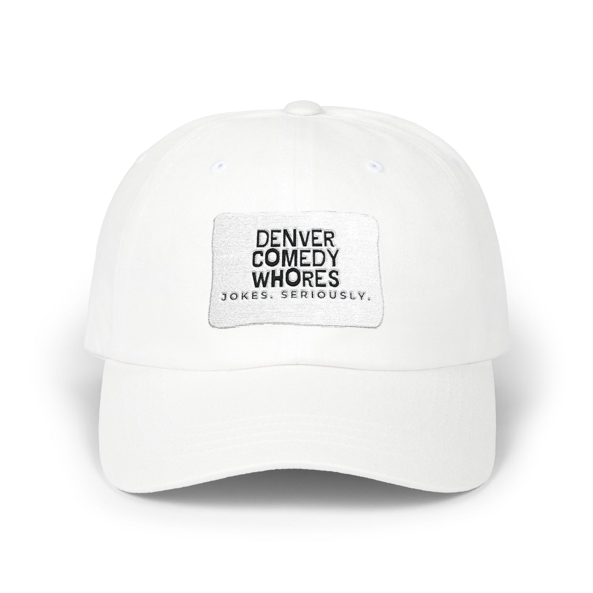 Denver Comedy Whores Patch Dad Cap — Vintage White Adjustable Baseball Hat